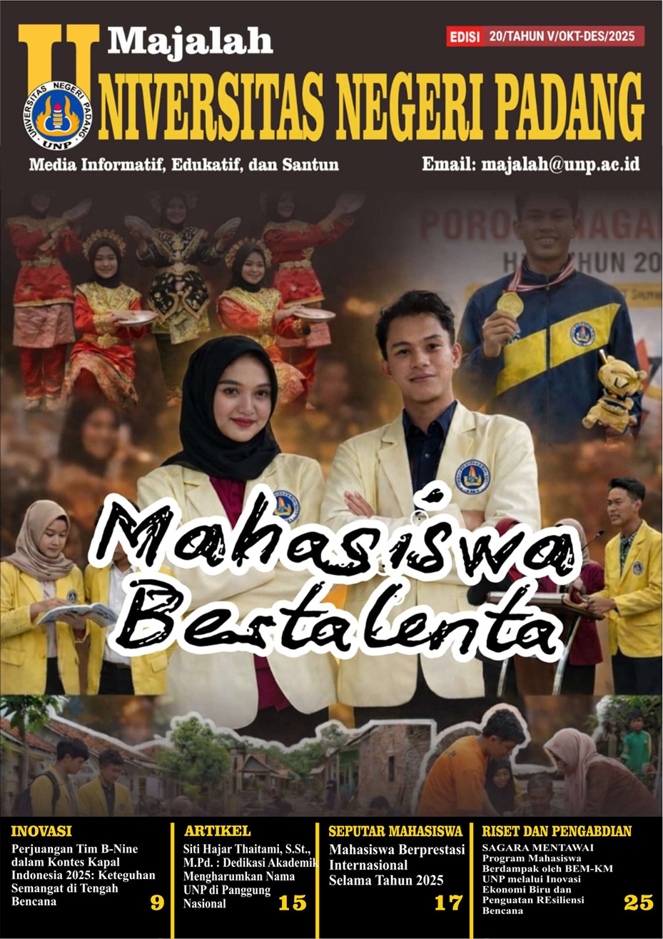 Edisi ke-20 ini menjadi catatan istimewa bagi Universitas Negeri Padang (UNP). Melalui data resmi SIMT Puspresnas Juli 2025, UNP dengan bangga mengukuhkan posisinya dalam jajaran Top 20 Perguruan Tinggi paling berprestasi di Indonesia sekaligus menjadi yang nomor satu di Sumatera. Torehan 191 medali nasional ini bukan sekadar angka, melainkan bukti nyata keberhasilan pola pembinaan terpadu—mulai dari seleksi prestasi hingga dukungan sarana yang mumpuni. Prestasi mahasiswa kita tidak hanya mengharumkan nama institusi, tetapi juga menjadi tulang punggung Sumatera Barat di ajang bergengsi seperti PON dan MTQN. Mari terus menginspirasi dan berkarya demi kejayaan kampus tercinta. (Prof. Dr. Erianjoni, S.Sos., M.Si)